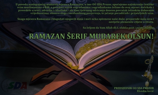 U povodu nastupajućeg mubarek mjeseca Ramazana, u ime Općinskog odbora Stranke demokratske akcije Prozor, upućujemo najiskrenije čestitke svim muslimanima u Bosni i Hercegovini, a posebno našim sugrađanima i sugrađankama želimo da ovaj mjesec dočekate i provedete u sreći, zdravlju i rahatluku, i da dani tjelesnog odricanja donesu povratak istinskim duhovnim vrijednostima, obnovu sloge i međusobnog povjerenja, te jačanje porodičnih i prijateljskih veza.