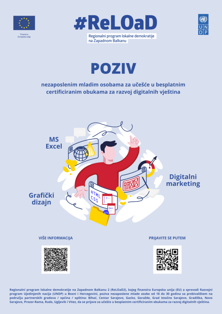 Regionalni program lokalne demokracije na Zapadnom Balkanu 2 (ReLOaD2) kojeg finansira Europska unija (EU) a sprovodi Razvojni program Ujedinjenih nacija (UNDP) u Bosni i Hercegovini, poziva nezaposlene mlade osobe od 18 do 30 godina sa prebivalištem na području partnerskih gradova / općina /: Bihać, Centar Sarajevo, Gacko, Goražde, Grad Istočno Sarajevo, Gradiška, Novo Sarajevo, Prozor, Rudo, Ugljevik i Vitez, da se prijave za učešće u besplatnim certificiranim obukama za razvoj digitalnih vještina.